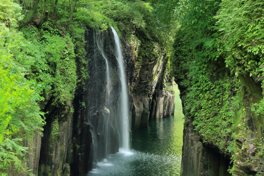 高千穂峡(宮崎県): 自然が作り出した高さ80mから100mに達する7キロの渓谷美を楽しみながら遊歩道を散策。天孫降臨の伝説が残る神秘的な真名井の滝をご覧いただけます。